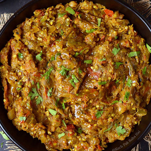 Smoky roasted eggplant mashed and cooked with onions, tomatoes, and aromatic spices for an authentic rustic flavor.